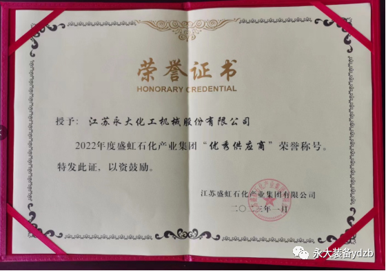 江苏永大化工机械股份有限公司被江苏盛虹石化产业集团有限公司授予优秀供应商荣誉称号。